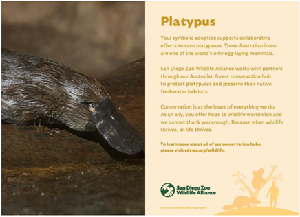 In 2023, I've Got You Under My Skein donated to the San Diego Zoo Wildlife Alliance. As part of our donation, we symbolically adopted a platypus.